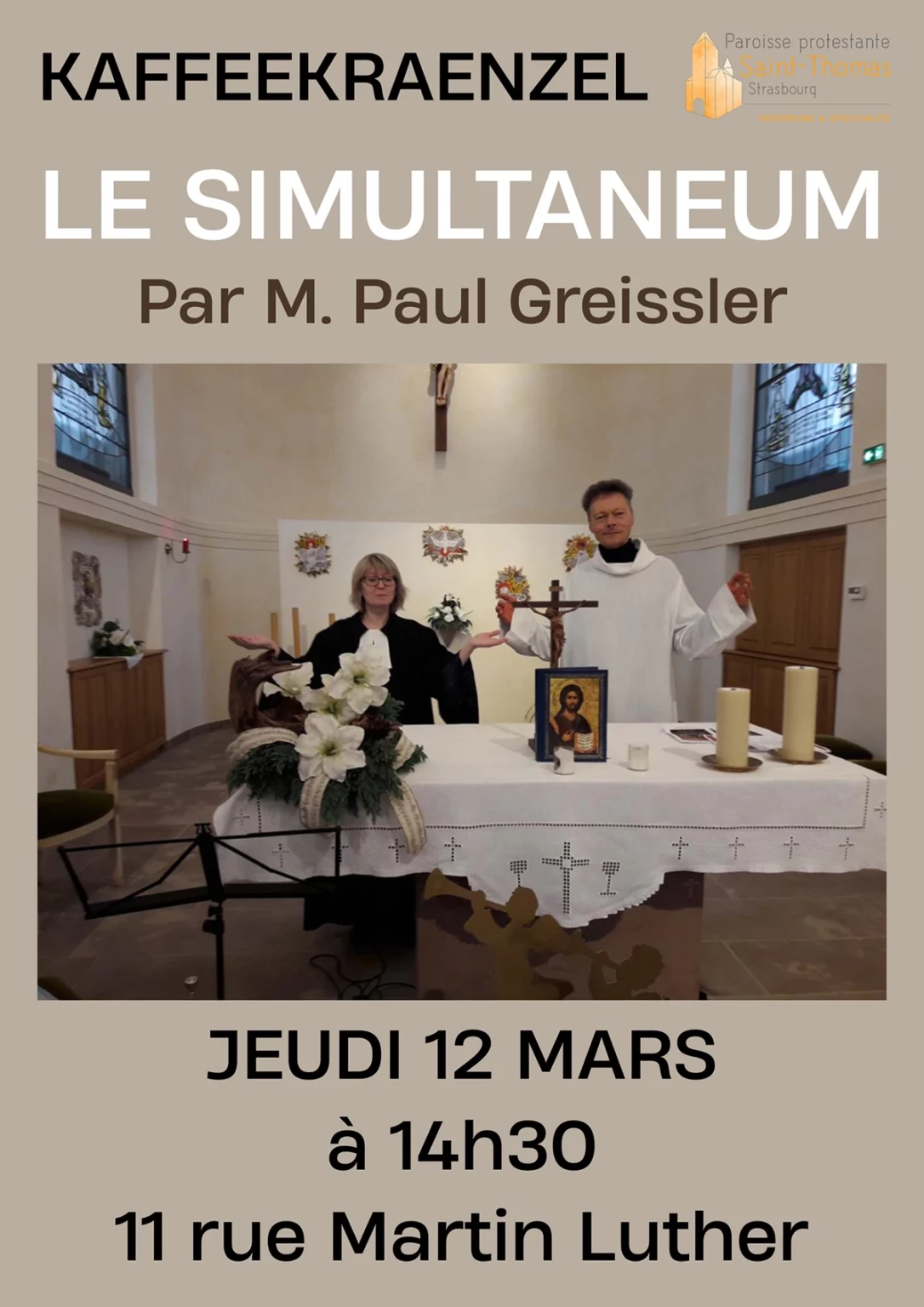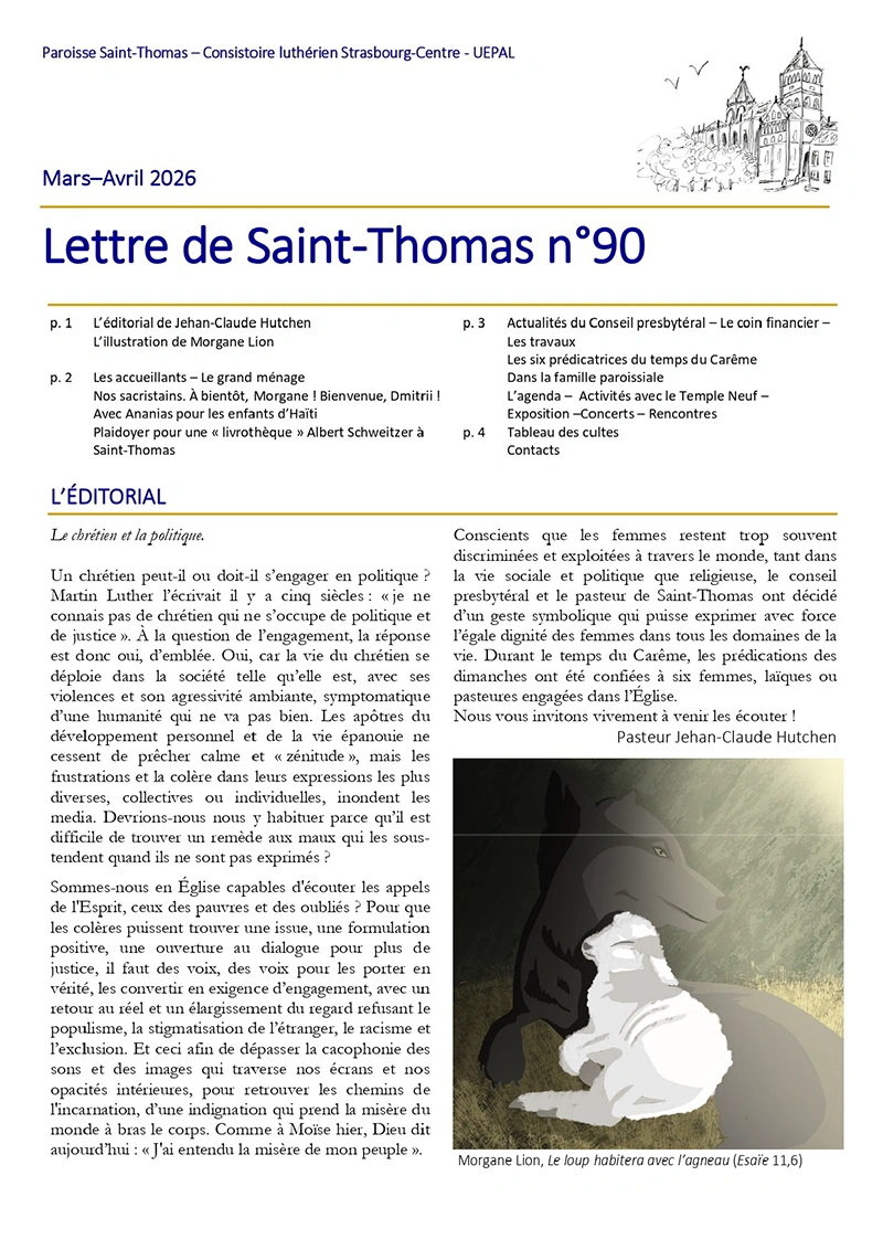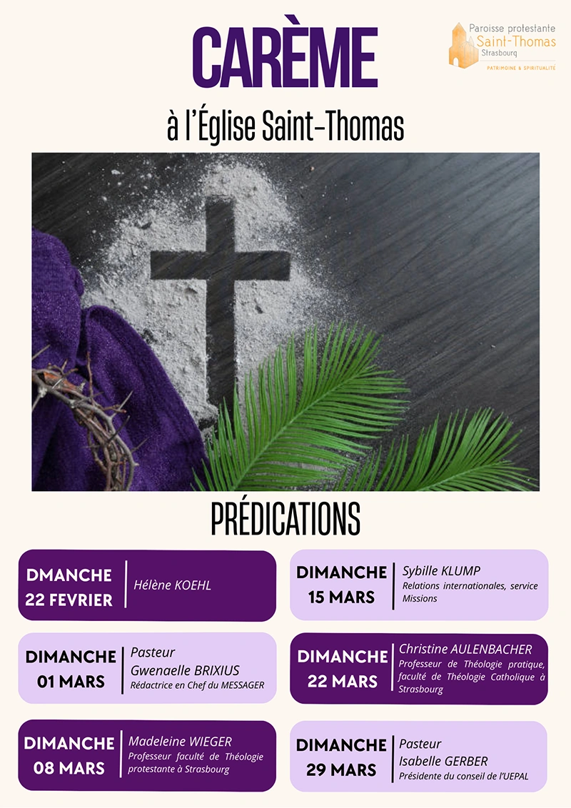 Actus & agenda Filtrer les actualités : Toutes les actus Concerts Événements Vie paroissiale Kaffeekraenzel Kaffeekraenzel : le simultaneum Lettre de Saint-Thomas Mars – Avril 2026 Carême à l’église Saint-Thomas Kaffeekraenzel: Découvertes en Grèce Concert anniversaire de la naissance d’Albert Schweitzer Kaffeekraenzel : L’art baroque, instrument de la contre-réforme Lettre de Saint-Thomas Janvier – Février 2026 Concert du Jour de Noël à Saint-Thomas Kaffeekraenzel – Autour de la crèche Concert de l’Avent – Péter Kováts Récital d’orgue Guy Feuerbach Lettre de Saint-Thomas Novembre – Décembre 2025 1 2 3 … 18 Suivant »