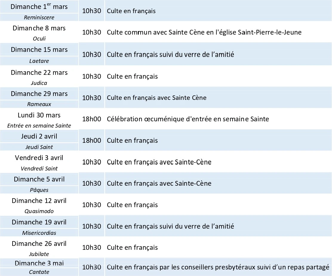 Tous les deuxièmes dimanches du mois les cultes ont lieu avec Sainte-Cène.