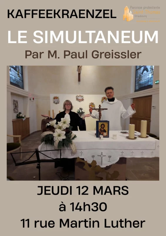 Le Kaffeekraenzel Kaffeekraenzel : le simultaneum Les KAFFEEKRAENZEL précédents : Kaffeekraenzel: Découvertes en Grèce Kaffeekraenzel : L’art baroque, instrument de la contre-réforme Kaffeekraenzel – Autour de la crèche Kaffeekraenzel – Albert Schweitzer par Georges Mary Kaffekraenzel – Voyage au Chili astronomique Kaffeekraenzel – Plantes médicinales des Vosges Kaffeekraenzel – Construire une école au Népal Kaffeekraenzel – Agroforesterie Kaffeekraenzel – Les corporations au Moyen-Âge à Strasbourg Kaffeekraenzel – Guerre de 30 ans Kaffeekraenzel – Cap sur le continent blanc l’Antarctique par Dr Christiane Mahler Kaffeekraenzel – Visite au Stift Kafeekraenzel – Germanisation des noms en Alsace Moselle Kafeekraenzel – Ascension du Mont Blanc Kaffekraenzel – Alfredo Müller, passion Italie Kaffeekraenzel – L’aumônerie militaire protestante Kaffeekraenzel – Événements à Saint-Thomas en vidéo Kaffeekraenzel – 1524 : une année charnière à Saint-Thomas Kaffeekraenzel – Birmanie: religion et dictature Kaffeekraenzel : autour de l’Épiphanie Kaffeekraenzel : partageons la joie et la paix de Noël Kaffeekraenzel : Épitaphes et monuments funéraires de l’Église Saint-Thomas Kaffeekraenzel : Hans Baldung, peintre alsacien Kaffeekraenzel : le Carnaval, c’est quoi ? Kaffeekraenzel : l’œcuménisme aujourd’hui Kaffeekraenzel : Hans Baldung Kaffeekraenzel : Histoire de la construction de l’église Saint-Thomas Kaffeekraenzel : Point sur ce qui nous attend cette année Kaffeekraenzel : à la découverte de l’Irlande Kaffeekraenzel : Cantate Dominum